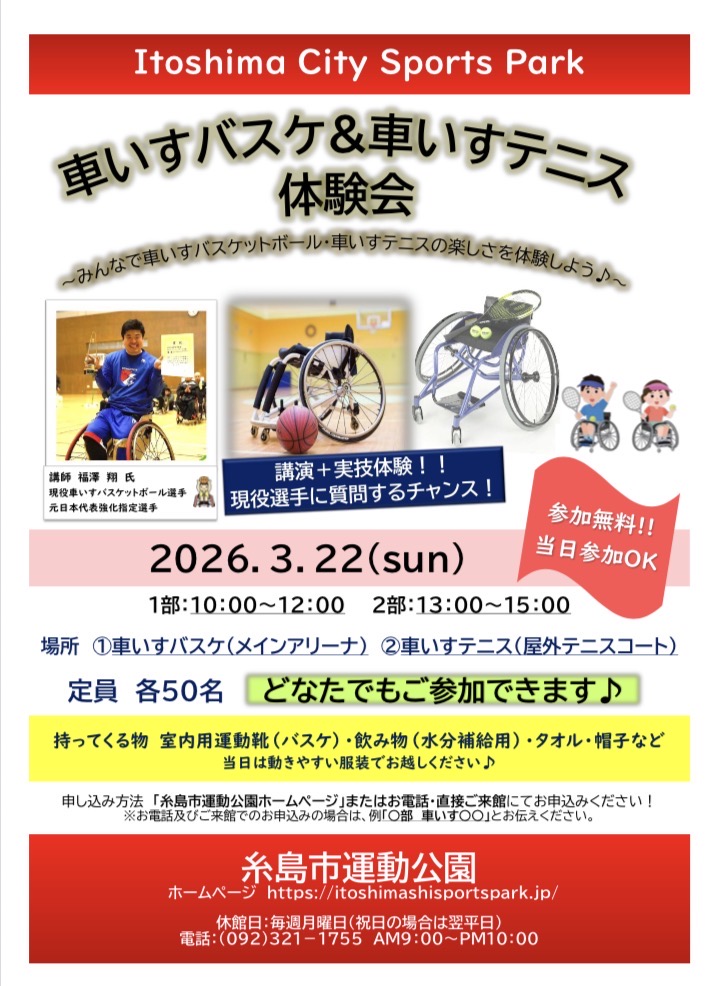 | 持ってくるもの | 室内用運動靴(車いすバスケ参加者の方)・飲み物・タオル・帽子など |